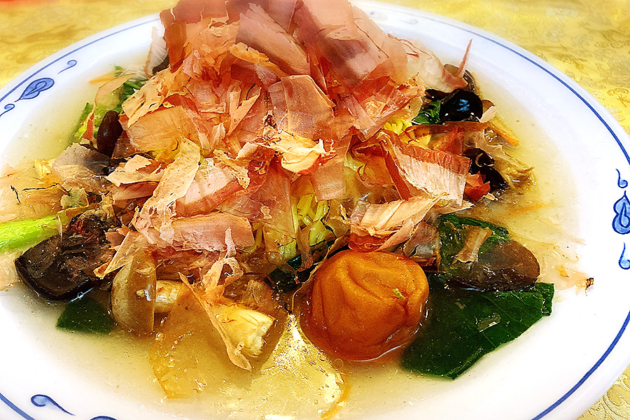 ボリューム満点の皿うどんだが、「女性でもペロリですよ」と山口さん。理由は、京都の野菜をたっぷりと使ったスープ。あっさりと和風にするため、仕上げにはかつお節が使われている。揚げ麺ではなく焼き麺なのも食べやすい理由だ。